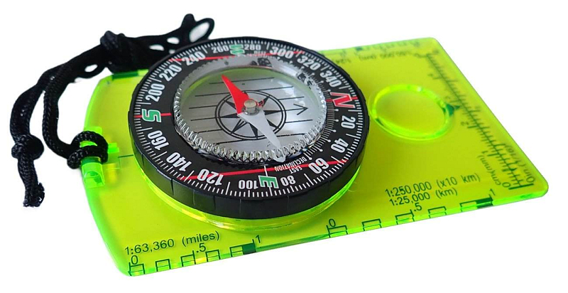 Buzola malá 114 x 62 mm. Buzola má směrovou šipku pro určení azimutu (úhlu pochodu), několik měřítek pro rychlé určení vzdálenosti na mapě a lupu pro čtení drobného textu. Buzola slouží pro orientační běh nebo pro turistiku a orientaci na mapě a v terénu. Součástí buzoly je šňůrka pro zavěšení buzoly na krk.