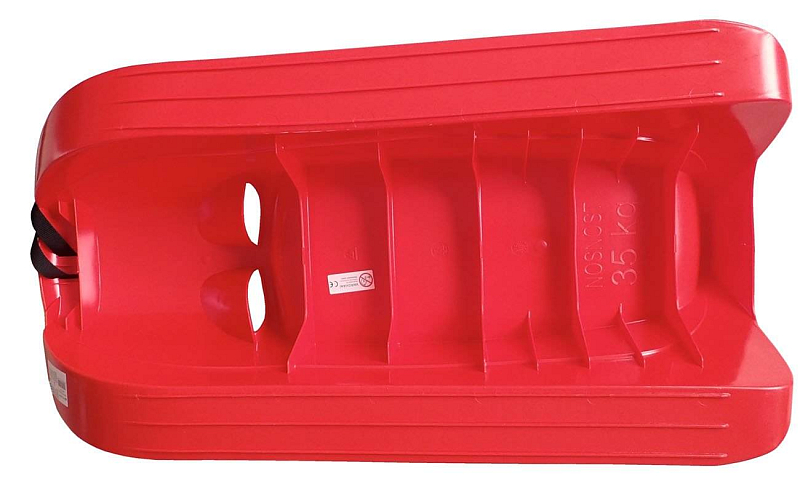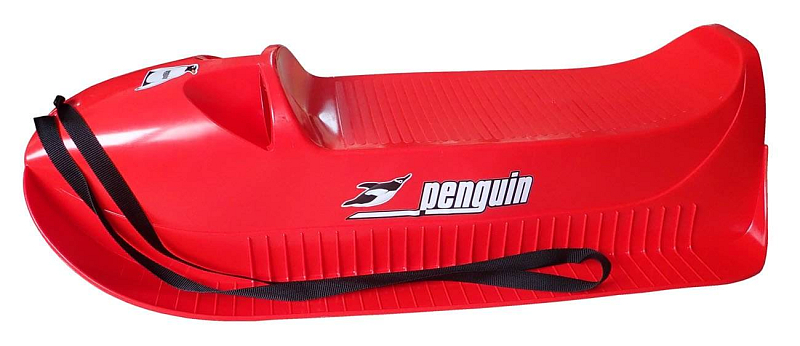 Sáně plastové PINGUIN s popruhem na tahání. Vhodné pro menší děti, saně mají v přední části dutiny na držení při jízdě. Délka saní je 88 cm a šířka, včetně stupátek, činí 42 cm. Nosnost 40 kg. K dispozici v barvě červené, viz foto.
