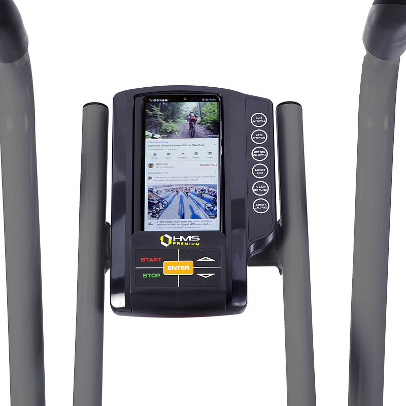 Air Bike HMS Premium MP8880 je nejkomplexnější stoj určený k vytrvalostnímu, silovému a kardio tréninku. Pohyblivá madla zapojují do tréninku ruce, díky tomu je jízda na Air Biku náročnější a zapojuje do práce větší část těla, než běžný rotoped. Na konstrukci nalezneme také 2 stupačky, na které si položíme chodidla a Air Bike MP8880 můžeme roztáčet pouze rukama. Tato variabilita nám umožňuje 3 druhy tréninku - pouze nohy, pouze ruce, celé tělo. Trenažér je také vybaven 4,6 kilogramovým zátěžovým kolem, které má na starosti plynulost pohybu a vyrovnávání slepých úhlů během pohybu choditel. Zátěž při šlapání je generována větrným kolem, které připomíná ventilátor, jeho lopatky jsou kolmo ke směru pohybu a během otáčení se využívá odporu vzduchu. Zátěž je přímo úměrná počtu otáček větrného kola, srozumitelně napsáno - čím rychleji šlapete, tím větší je zátěž. Každý si tak může najít ideální rytmus pro svůj trénink. Profesionálně se Air Bike využívá při funkčním tréninku, kdy se na trenažéru "jezdí intervaly", dochází ke střídání dvou krátkých, časových úseků, kdy například 10 vteřin šlapeme na plný výkon a 20 vteřin odpočíváme. K tomuto tréninku je MP8880 vybaven velikým a přehledným počítačem, který zobrazuje veškeré údaje na jedné obrazovce. Zobrazené údaje se liší podle…