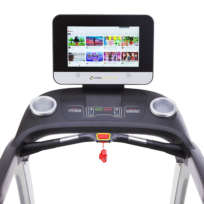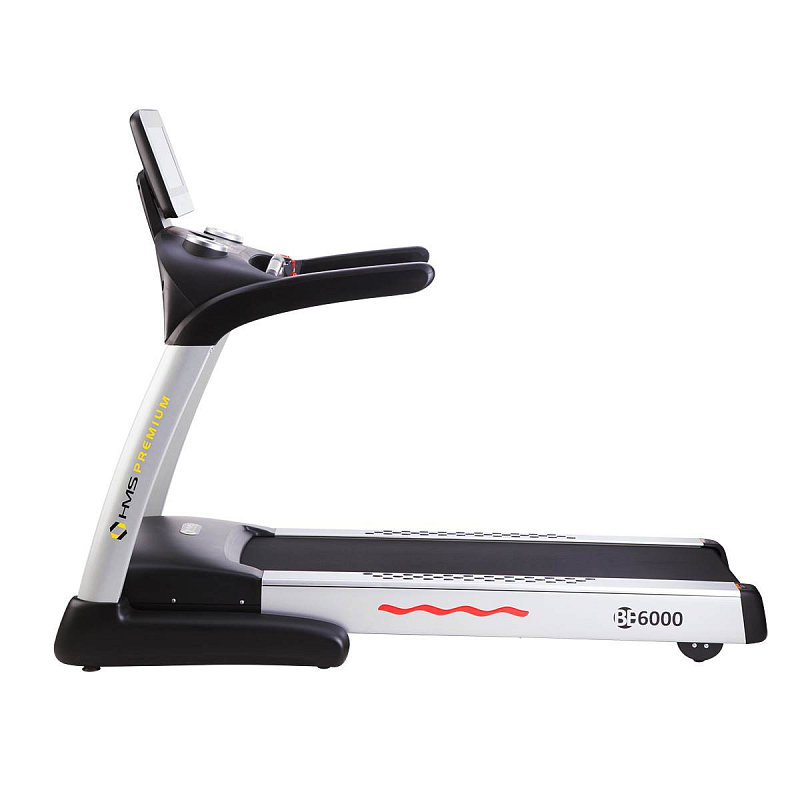 BE6000 HMS Premium je elektrický běžecký trenažér, který spadá do kategorie Semi Comercial a je tak vhodný jak pro použití v domácnosti, tak v klubových, hotelových posilovanách a v nejrůznějších odpočinkových zařízeních jako jsou lázně a podobně. Velká běžecká plocha o rozměrech 52 x 150 cm je odpružena systémem anti-shock, který snižuje namáhání kloubů během tréninku. Trenažér je vybaven systémem elektronického naklápění a motorem o výkonu 2 koňských sil, ten dokáže běhoun rozpohybovat až na rychlost 22 km/h. Veliká a přehledná ovládací konzole je vybavena bezpečnostní pojistkou, která zastaví pás v případě pádu, madly pro měření tepové frekvence a dvěma otvory například pro láhev s vodou. Celý systém se nastavuje a ovládá pomocí 15,6" dotykové obrazovky. V podstatě se jedná o pevný tablet se systémem Android, ve kterém jsou předinstalované aplikace jako Twitter, Facebook, YouTube,... Mechanická klávesnice obsahuje tlačítka "START", "PAUSE/STOP" pro spuštění, pozastavení a ukončení tréninku. Dvojici tlačítek pro plynulou změnu rychlosti běžecké plochy a dvojici tlačítek pro nastavení sklonu běžecké plochy. Nad tlačítky se nachází výřez pro odložení mobilního telefonu, který zároveň slouží jako bezdrátová nabíječka. Ze strany konzole nalezneme 3,5 mm vstup pro připojení…
