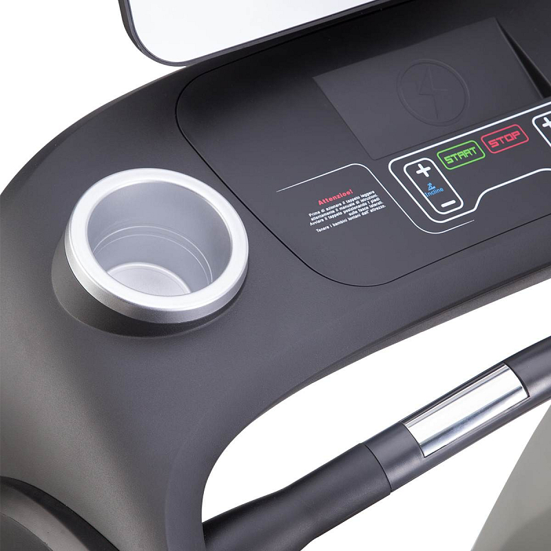 Veliká a přehledná ovládací konzole je vybavena bezpečnostní pojistkou, která zastaví pás v případě pádu, madly pro měření tepové frekvence a dvěma otvory například pro láhev s vodou.