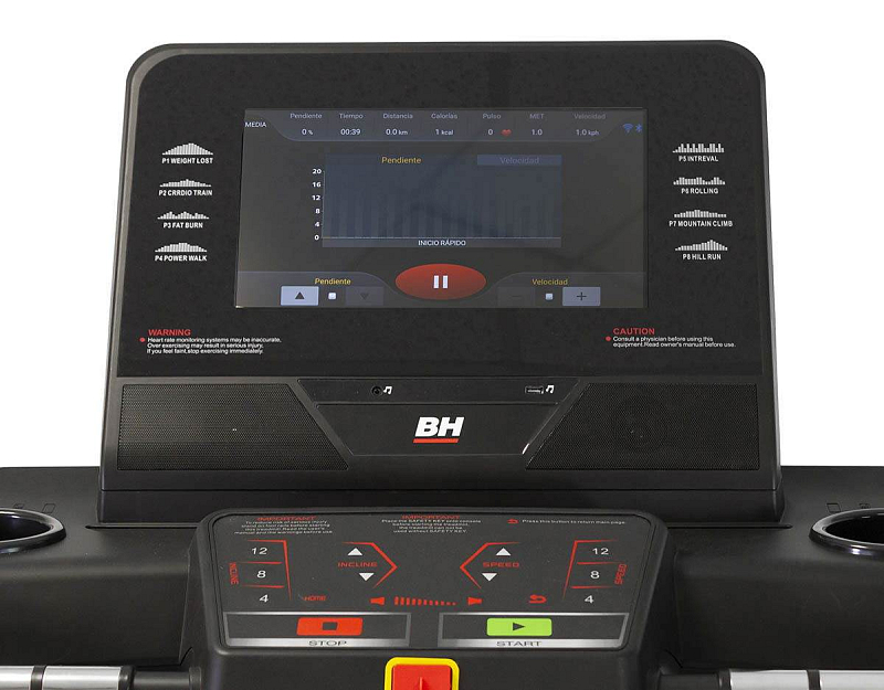 Ovládací konzole trenažeru BH Fitness RS900TFT je vybavena přehledným 15" dotykovým interaktivním displejem. Ovládání je velice jednoduché, kromě manuální regulace rychlosti a sklonu jsou součástí přednastavené zátěžové profily, které podle křivky regulují rychlost.