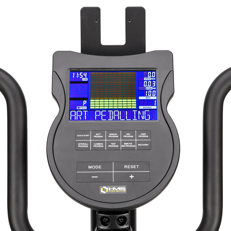 Elektromagnetický rotoped HMS Premium M6152 je ideálním nástrojem pro osobní kardio trénink v domácím prostředí. Počítač modelu M6152 je vybaven přehledným displejem, který zobrazuje veškeré důležité údaje pro přehledný trénink. Dominantou je matice, která zobrazuje průběh aktuálně zvoleného programu rozděleného do 10-ti časových úseků. Každý sloupeček znázorňuje zvolenou zátěž aktuálního úseku. Kromě matice zobrazuje displej také všechny potřebné údaje k vyhodnocování tréninku: čas tréninku, aktuální rychlost, počet otáček, vzdálenost, výkon, spálené kalorie a tepová frekvence. Pod displejem se nachází tlačítka pro obsluhu počítače. Zvolit si můžeme vždy jeden z 9 programů, jde o 3 vestavěné, 1 uživatelsky definované programy a dále o celkem 5 programů pro WATT, H.R.C a Recovery. Nad počítačem se nachází držák pro odložení mobilního zařízení. Brzdný systém modelu M6152 se skládá z 6-ti kilogramového, zátěžového kola a elektromagnetu, který podle napětí mění intenzitu generovaného magnetického pole. Toto řešení je tiché, bezúdržbové a díky elektromagnetu má trenažér 32 stupňů zátěže. Tento rozsah umožňuje ideální a naprosto plynulé nastavení tréninku pro jakkoliv pokročilého jezdce. Konstrukce modelu M6152 je vyrobena ze solidní oceli, díky které je nosnost trenažéru až 120…