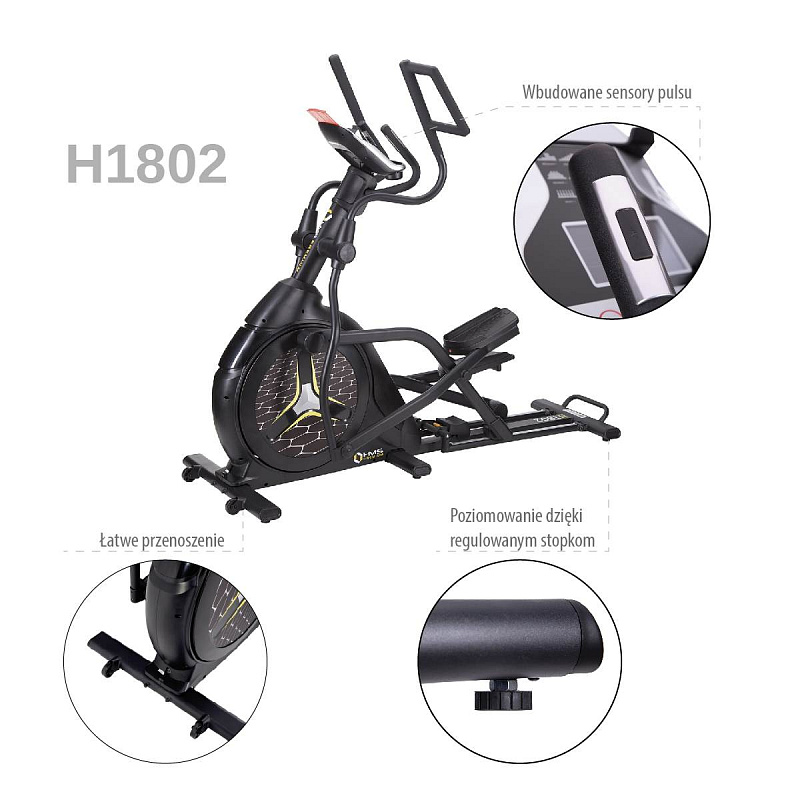 Eliptický trenažér HMS Premium H1802 je určen pro intenzicní trénink ať už v doma, nebo například v klubové posilovně, nebo v hotelovém fitnessu. Největší předností modelu je stabilní konstrukce a 9-ti kilogramové zátěžové kolo v kombinaci s tichou, magnetickou brzdou.