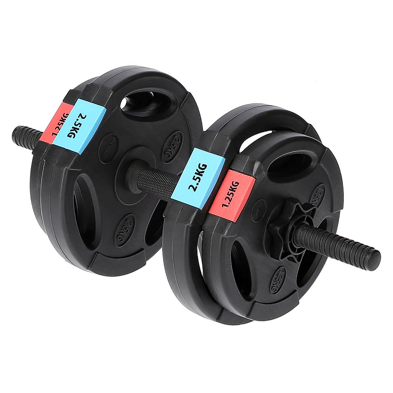 Kotouče jsou vyrobeny z trvdého plastu, který je vyplněn cementem. Obouruční osa je tvořena ze tří částí, které se do sebe skládají pomocí šroubení. Nakládací trny jsou hladké a závaží se zajišťuje pružinovými svorkami. Trny jednoručních činek jsou opatřeny závitem a závaží je jištěno hvězdicovými maticemi.