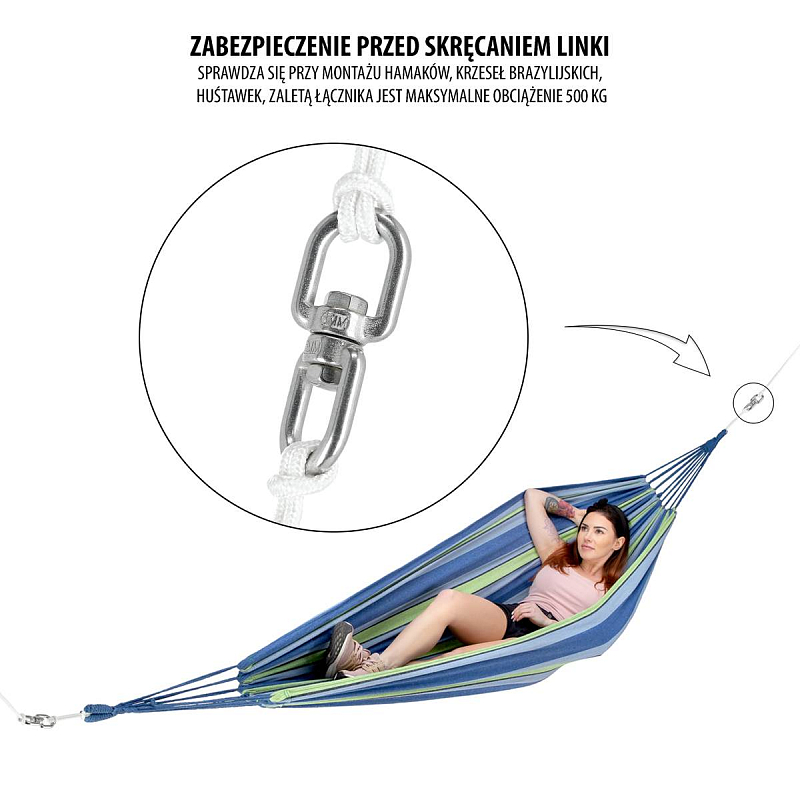 Ocelové, otočné oko NILS Camp NB5041 je určeno jako ochrana před kroucením a zamotáváním lan u houpaček, houpacích sítí a brazilských křesel během používání. Nosnost jednoho oka je až 500 kilogramů. Parametry: Materiál: pozinkovaná ocel Délka: 9 cm Rozvor (průvlak): 2 cm Nosnost: 500 kg Hmotnost: 105 g Upozornění: Certifikát, norma: Záruka: 24 měsíců