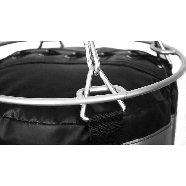 Náplň každého boxovacího pytle se postupně zhutňuje, čímž vzniká v horní části pytle dutý prostor, který se pod tíhou pytle začne stlačovat řetězy. To zhoršuje vizuální efekt a zmenšuje tréninkovou plochu. Použití obruče na řetězy pytle zajišťuje, že si pytel po celou dobu zachovává svůj původní tvar a poskytuje atraktivní vzhled a optimální technické parametry. Použití obruče se doporučuje zejména v případě, že standardní délka řetězů bude zkrácena z důvodu nízkého tréninkového prostoru (čím kratší řetězy, tím větší tlak řetězů na povrch pytle). Při tréninku na pytli často dochází ke zkroucení nosných popruhů. Takové zkroucení vede k nerovnoměrnému rozložení hmotnosti pytle na popruhy, což může způsobit jejich rychlejší opotřebení nebo roztržení švů. Použití obruče zaručuje přirozené vyrovnání popruhů a zabraňuje jejich kroucení během tréninku. Parametry: Materiál: pozinkovaná ocel Průměr obruče: 40 cm Průměr drátu: 8 mm Rozměry oka: 20 x 40 mm Počet ok: 4 Upozornění: Certifikát, norma: Záruka 24 měsíců