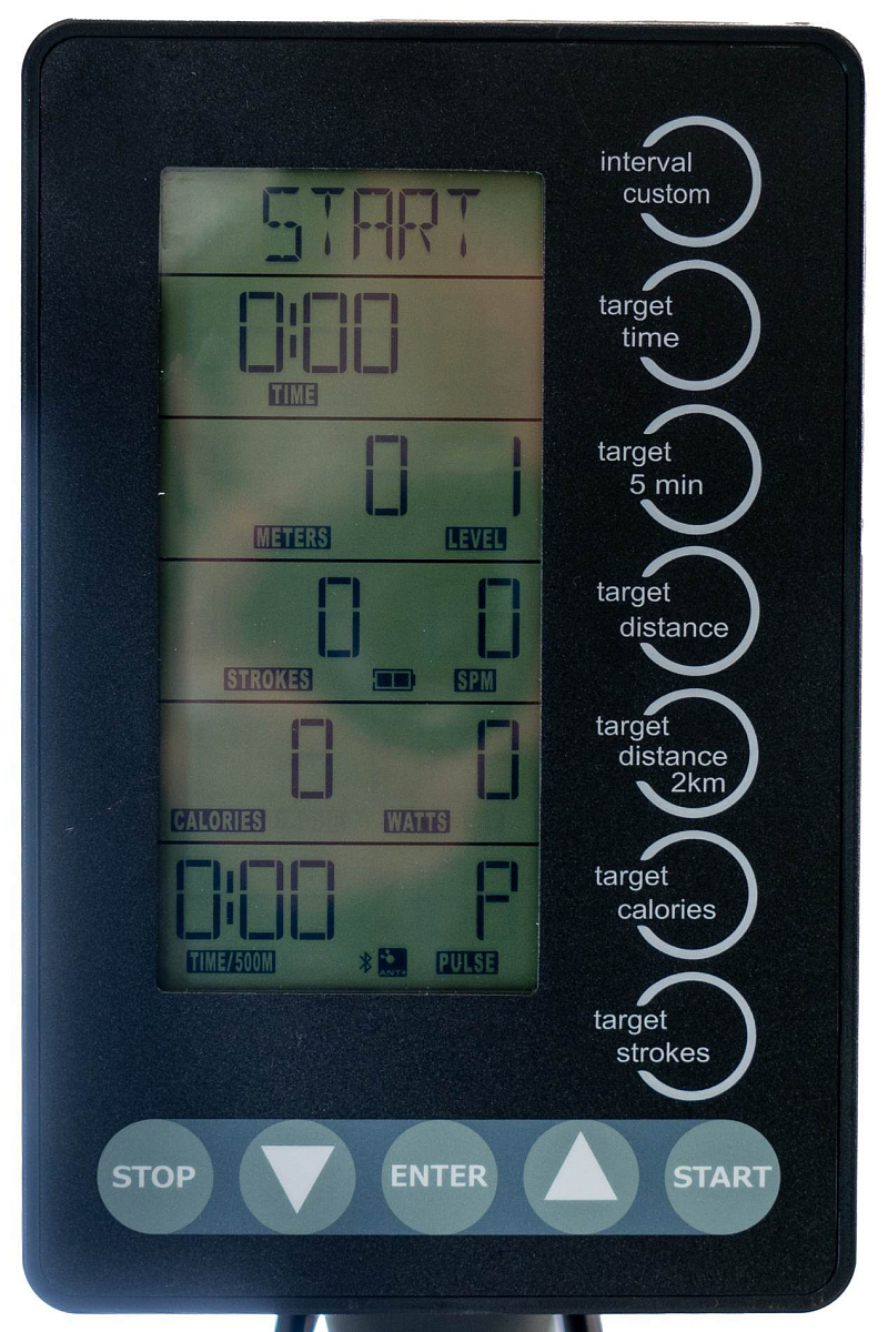 Přístroj je vybaven samonapájecím 5,5" LCD monitorem, který přehledně zobrazuje všechny důležité údaje jako čas, vzdálenost, záběry za minutu (SPM), kalorie, watty a tepovou frekvenci. K tomu navíc nabízí Bluetooth a ANT+ konektivitu, takže ho snadno spárujete s chytrými aplikacemi, díky kterým lze můžete sledovat svůj pokrok.