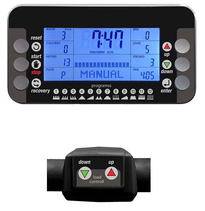 | Měřené hodnoty: | Čas veslování, Rychlost (km/h), Spálené kalorie, Počet záběrů, Počet záběrů za minutu, Tep srdce, Vzdálenost, Signalizace překročení tepu, Zobrazení zátěže na displeji, Výkon ve wattech |